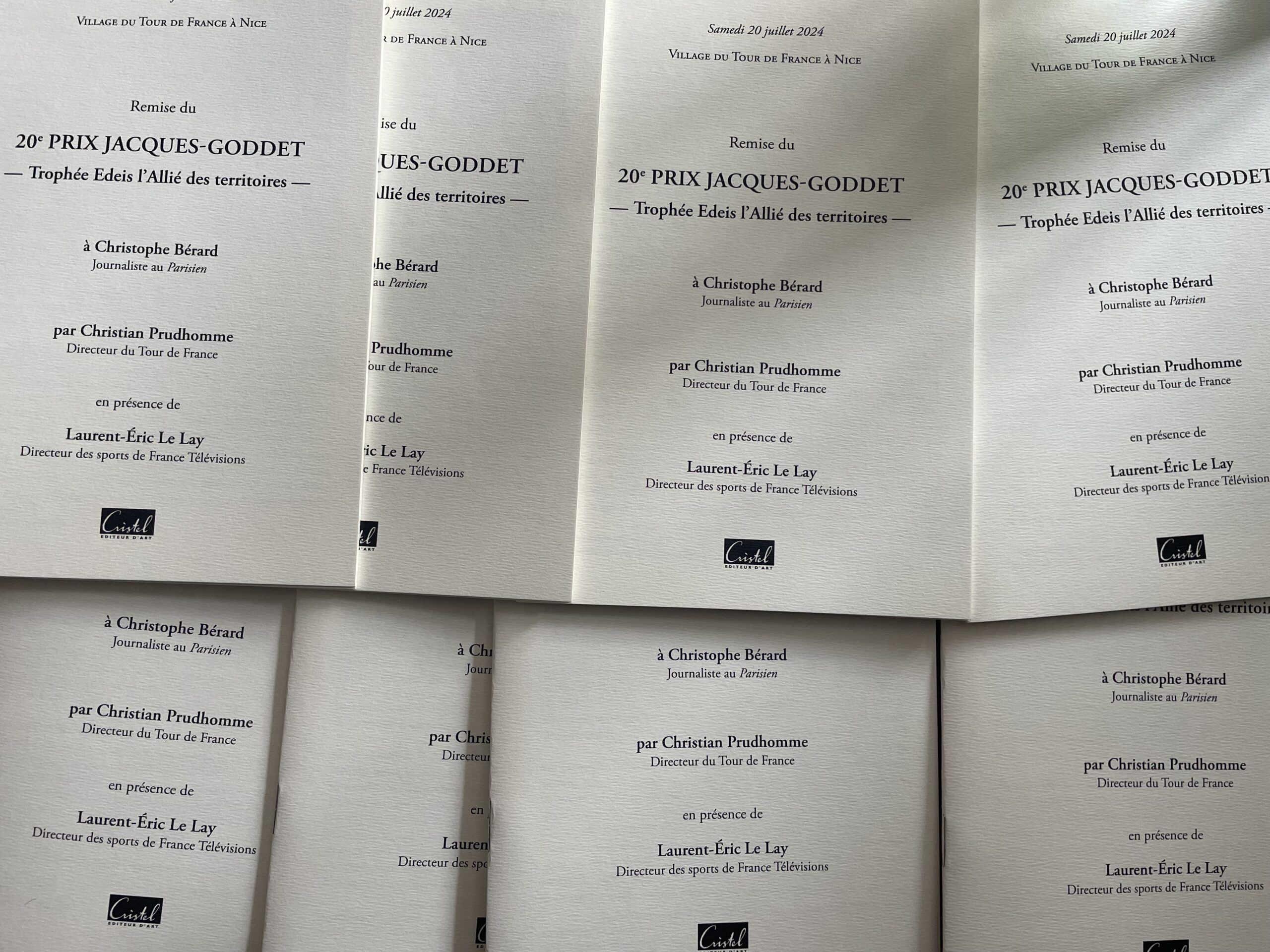 Pour l’heure, remise du 20e Prix Jacques-Goddet à Nice, ce samedi 20 juillet 2024, à Christophe Bérard, des mains de Christian Prudhomme, directeur du Tour de France, et de Laurent-Éric Le Lay, directeur des sports de France Télévisions et président du 20e jury. La belle affiche !